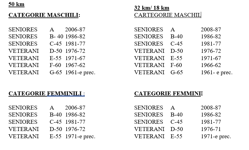 Inoltre verranno premiati i primi tre di ogni categoria uomini e donne come da regolamento secondo lo schema sotto riportato.