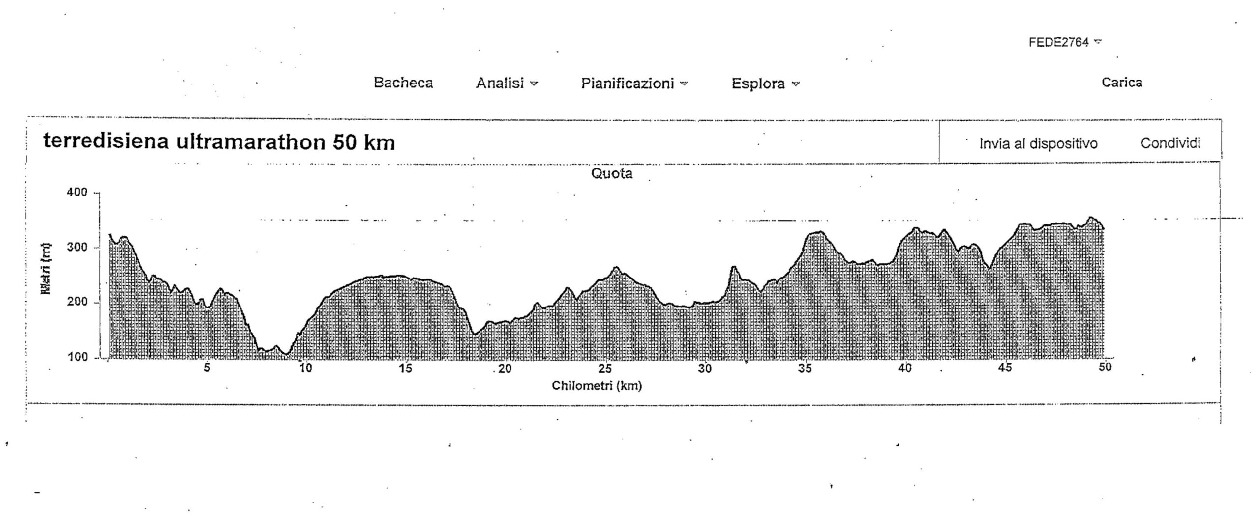 Km 50 E’ un percorso in linea collinare con un altimetria positiva di 600 mt. , con un punto massimo di 350 mt s.l.m. e 110 mt s.l.m. come punto più basso da cui si deduce che vi saranno brevi salite alternate da piccoli tratti di discesa. Percorso sicuramente muscolare ma alla portata di atleti abituati alle maratone o a chi pratica trail di lunga distanza.